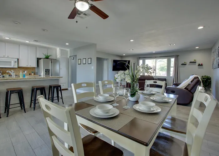 La villa Las Vegas Retreat With Yard Less Than 5 Mi To Strip! también cuenta con una cocina bien equipada con un lavaplatos, un horno y una placa. Los huéspedes tienen la opción de comer en el restaurante Mochiko Chicken, que está a tan solo 13 minutos a pie. Los viajeros pueden llegar fácilmente al aeropuerto internacional Mccarran de Las Vegas, que está a 5 km de esta casa de vacaciones.